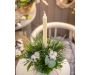 Vánoční svícen, eukalyptus, více druhů chvojí, jedle nobilis a borovice vejmutovka, bavlník, a rustikální svíčka.