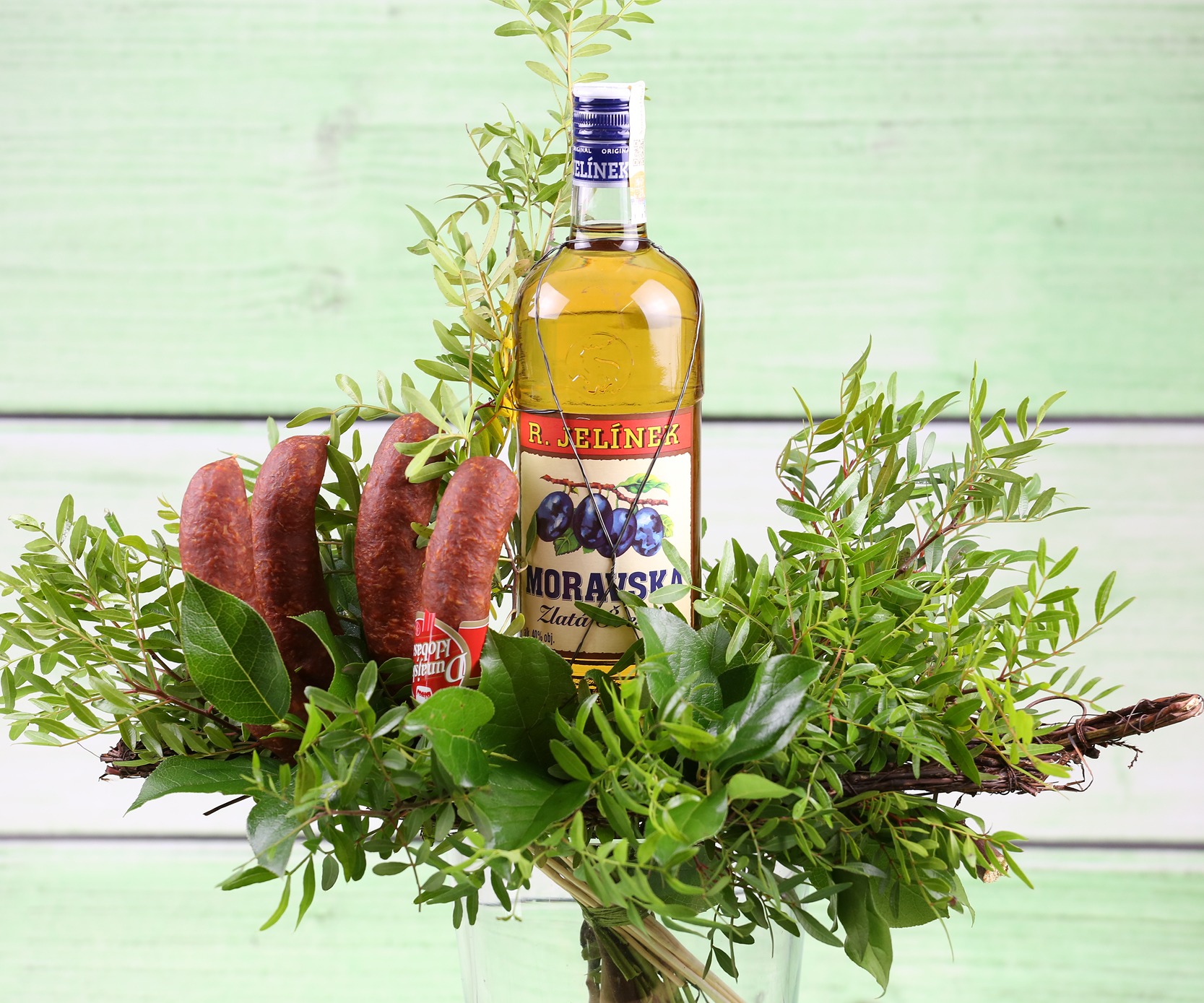 Slivovice - Netradiční kytice se slivovicí (1l) je součástí květiny pomocí speciálního držáku. Autorské řešení pouze v KVĚTINY DNES.